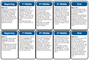 Ok, so… After you form everyone into teams of 5 you can work out how many bible stories you’ll use from the deck (ie. 10 teams = 10 stories. There’s 12 stories in a deck so remove the remaining 2 stories). Designate a captain from each team of 5 and deal out 1 card from each of the 10 stories (maybe just give them the “beginning” card from each story), that’ll leave 4 cards for each story.